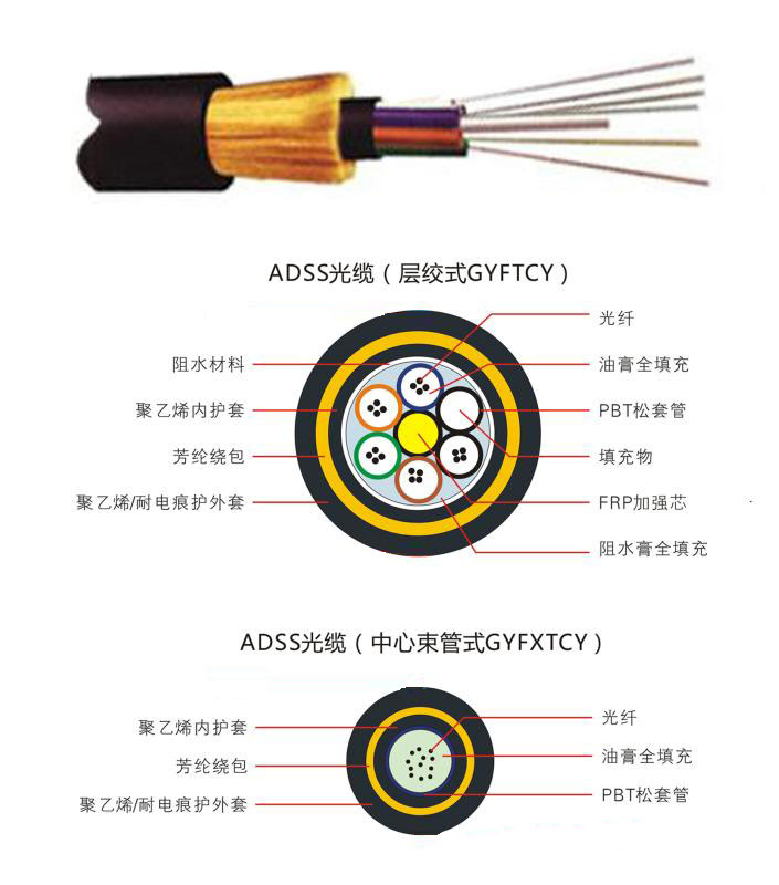 漢信ADSS 光纜采用松套層絞式結構,將 250μm 光纖套入高模量材料制成的松套管中,松套管內填充防水化合物。松套管(和填充繩)圍繞非金屬中心加強芯(FRP)絞合成緊湊的纜芯,纜芯的縫隙充以阻水油膏。纜芯外擠制聚乙烯(PE)內護套,然后絞合起加強作用的芳綸,最后擠制聚乙烯(PE)外護套或耐電痕(AT)外護套。