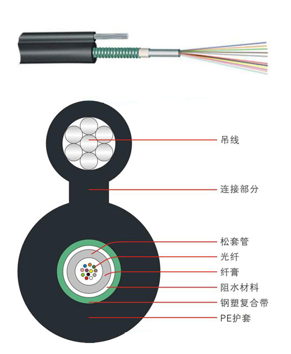 漢信 GYXTC8S光纜的結(jié)構(gòu)是將 250μm 光纖套入高模量材料制成的松套管中,松套管內(nèi)填充防水化合物。松套管外用一層雙面涂塑鋼帶(PSP)縱包,鋼帶和松套管之間加阻水材料以保證光纜的緊湊和縱向阻水,和鋼絲絞線集成到一個8字型的聚乙烯護套內(nèi)。