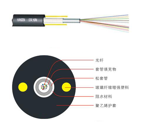 漢信GYFXY 光纜的結(jié)構(gòu)是將 250μm 光纖套入高模量材料制成的松套管中,松套管內(nèi)填充防水化合物。松套管外加阻水材料以保證光纜縱向阻水,兩側(cè)放置兩根平行玻璃纖維增強塑料(FRP)后擠制聚乙烯護套成纜。